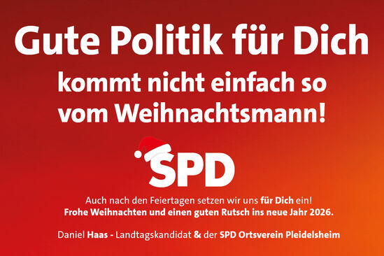 herzlich willkommen auf den Internetseiten des SPD Ortsvereins Pleidelsheim. Als Vorsitzender der SPD Pleidelsheim ist es mir ein zentrales Anliegen, nah bei den Menschen zu sein. Kommunalpolitik darf nach meinem Verständnis nicht abgehoben sein, sondern braucht die Bodenhaftung und das Gespräch mit den Menschen vor Ort.